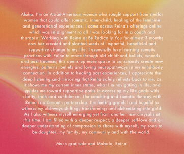 "I immediately felt relieved to skip all of the cultural explanations about how Japanese society models intimacy, vulnerability, confidence, etc. This aspect of working with Reina is priceless, I feel incredibly understood and seen. I believe that I was guided to Reina by my ancestors to dive into my cultural identity issues, decolonization, and to help heal my family's generational traumas. I am so thankful that Reina and I can talk about concrete things as well as metaphysical and ethereal, I had never even considered that I'd be able to find a therapist like this and I'm so so grateful.